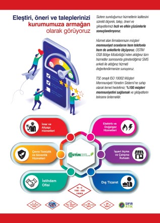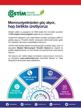 • OSTİM OSB Müşteri İlişkileri Koordinatörlüğü’ne iletilen talep, öneri ve şikayetler Müşteri Memnuniyeti Yönetim Sistemi’yle objektif bir şekilde değerlendirerek, en hızlı sürede sonuçlandırmak üzere işleme alınır.